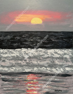 Ocean Sunset is fourteen by eighteen-inch painting inspired by a photo of the ocean at sunset off the coast of Ecuador.